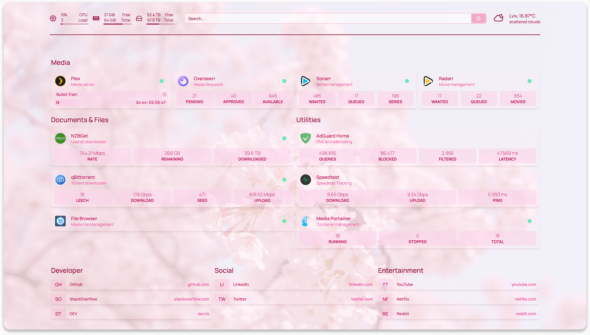 - Ombi, Overseerr, Jellyseerr, Jackett, NZBGet, SABnzbd, ruTorrent, Transmission, qBittorrent and more