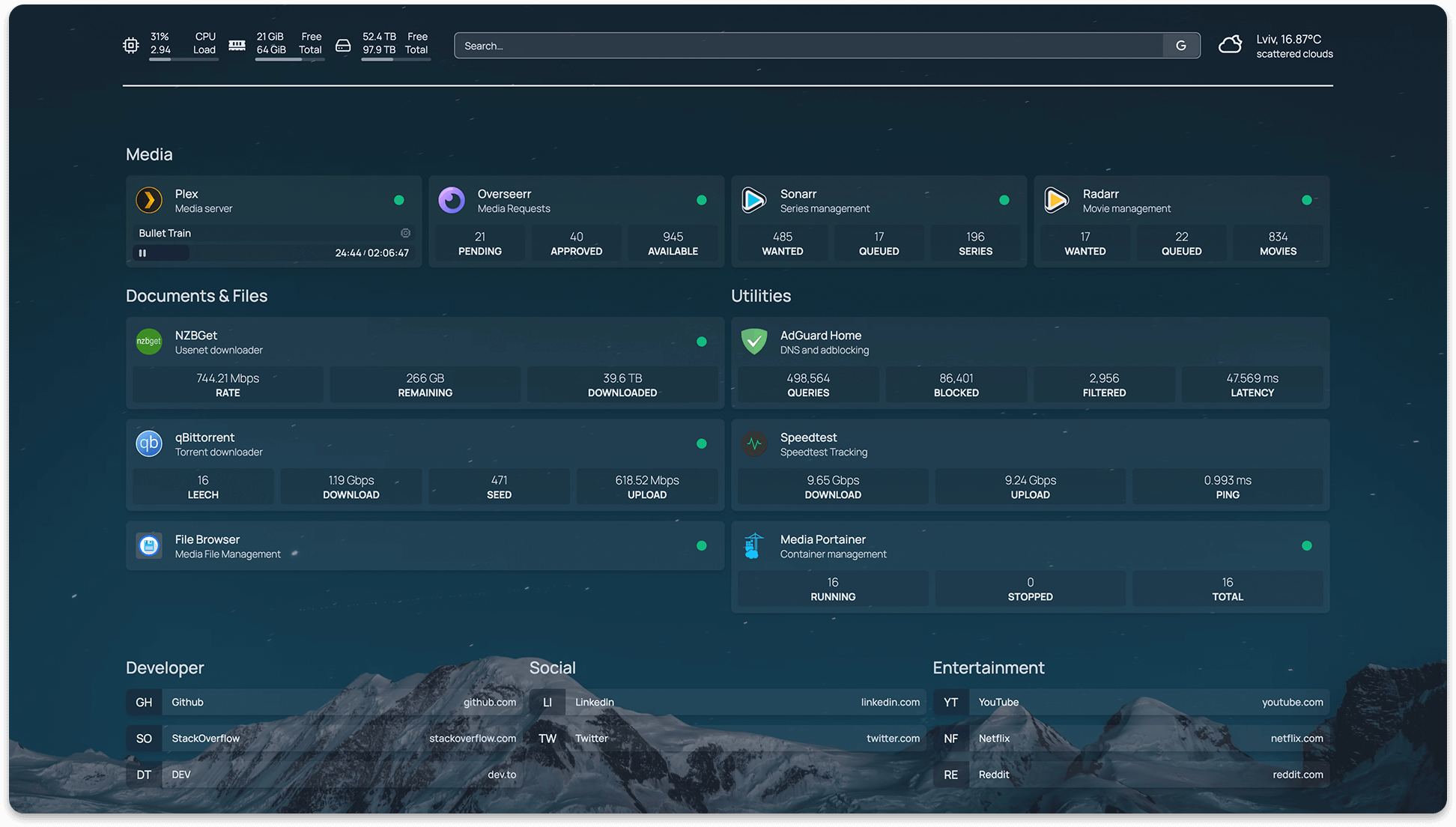 - Ombi, Overseerr, Jellyseerr, Jackett, NZBGet, SABnzbd, ruTorrent, Transmission, qBittorrent and more
