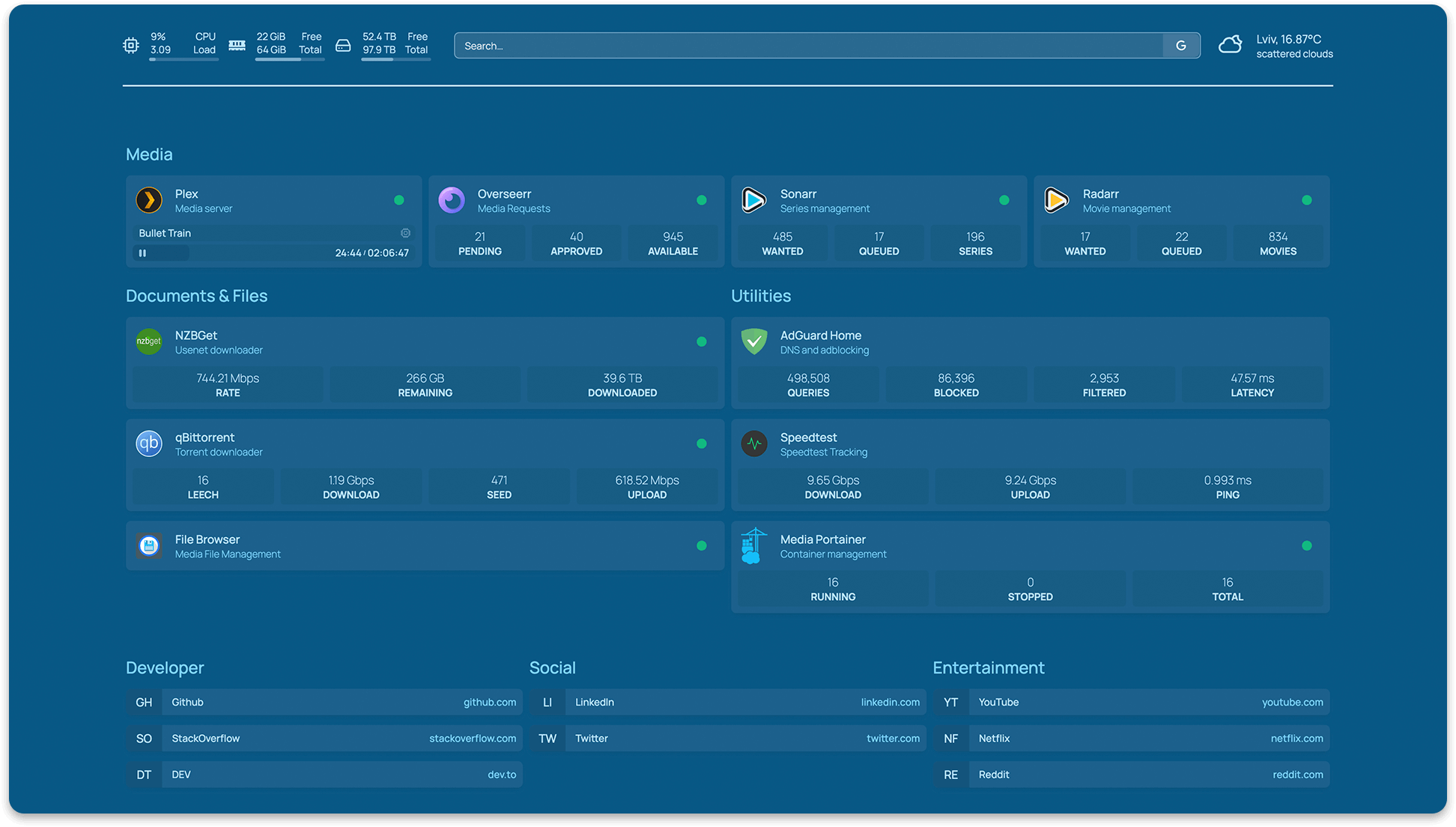 - Ombi, Overseerr, Jellyseerr, Jackett, NZBGet, SABnzbd, ruTorrent, Transmission, qBittorrent and more